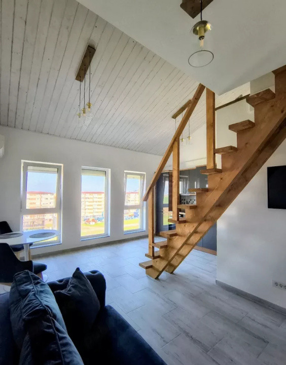 Proprietatea se află la etajul 6/6 și are o suprafață de 47 mp, fiind compartimentată eficient pe două niveluri: living, bucătărie open-space și baie la parter, respectiv dormitor și baie la etaj.