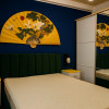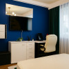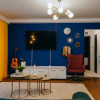 Living spațios și vibrant, decorat în nuanțe de albastru intens, verde smarald și accente aurii, completat de mobilier modern și un TV de perete generos.