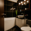 Baie, finisată cu plăci ceramice negre și aurii, dotată cu cadă.